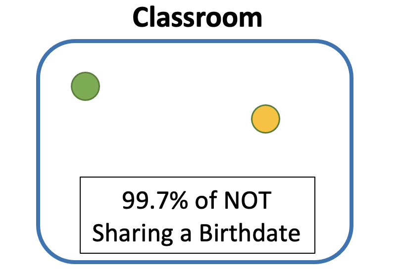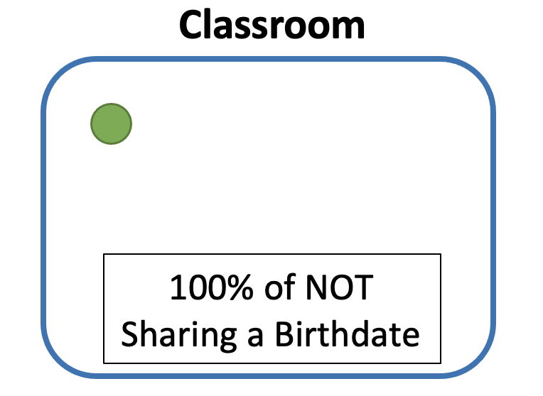 Let’s tackle this problem with an experiment by creating a classroom that is going to slowly fill up with students. As the first students comes into the room, the probability that they doesn’t share a birthday with any one in the room is 100%. This should make sense because there is no one else in the room, so of course there is a 100% chance.