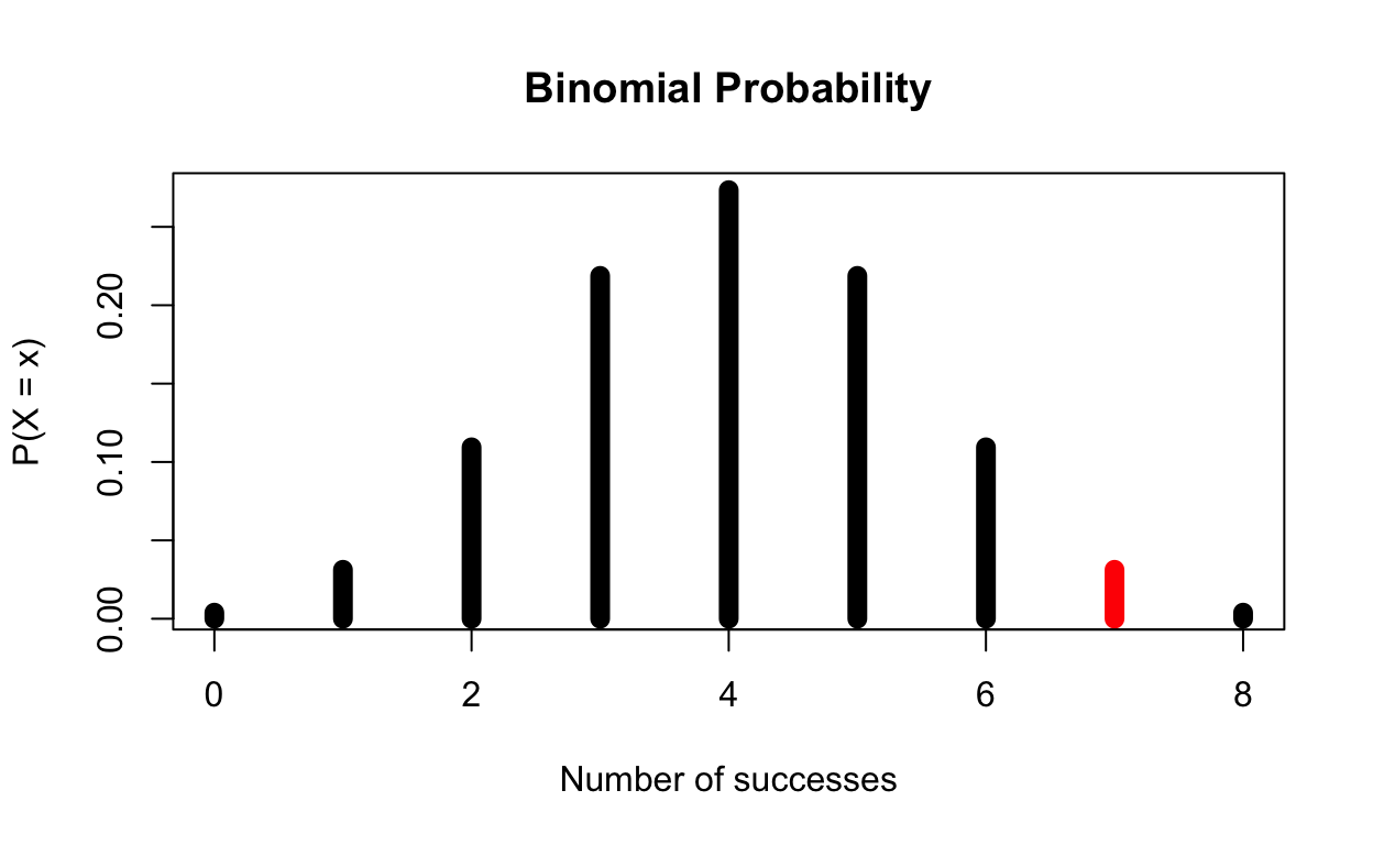 \[ \text{P(X} > 7| H_0 = \text{true)}\ \text{= P(X = 7| p = 0.5)} \]