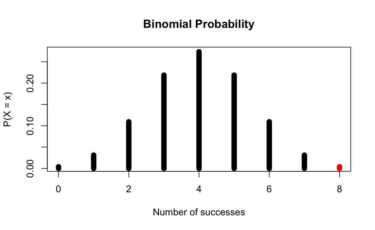 \[ \text{P(X} > 8| H_0 = \text{true)}\ \text{= P(X = 8| p = 0.5)} \]