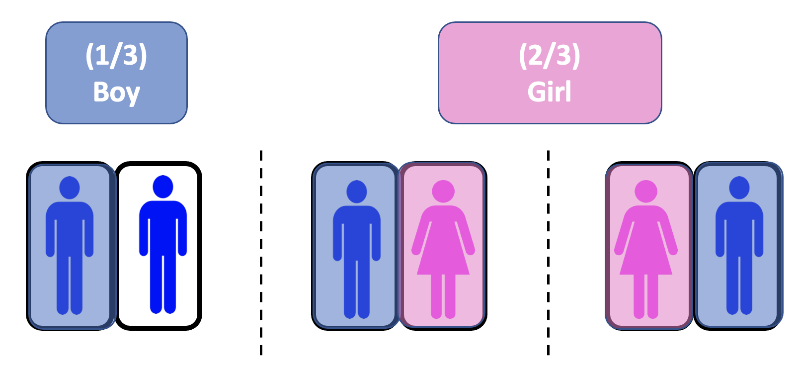 With the aid of this last visual, we can see that there is a probability of 33% that the other twin is a boy and a 66% that the other twin is a girl.