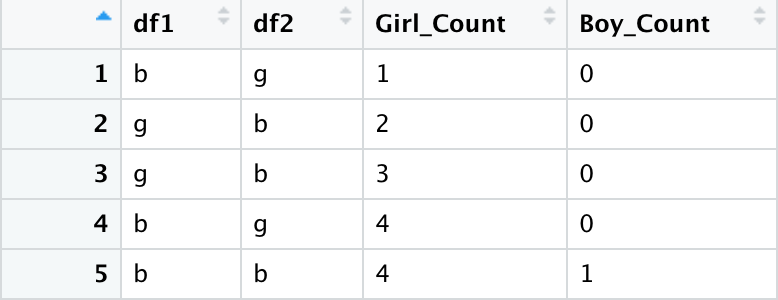Next, I created two running sum columns, one for Girl and one for Boy. The Girl column, would first, see if there was a ‘g’ in either column 1 or 2, if there was, it added 1 to the sum. The Boy column, looked to see if both columns in each row had ‘b’.
