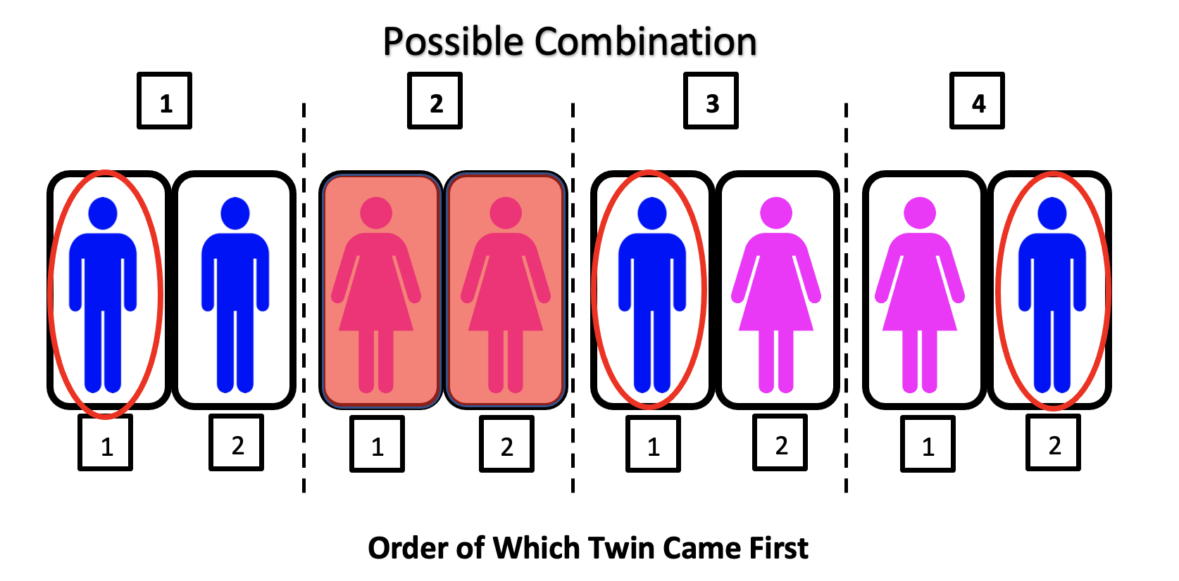 And thanks to our knowledge of biology, this same statement applies. The probability of have a boy or girl is 50%. So why then isn’t the answer to the ‘Twin Problem’ just 50% girl and 50% boy? It is because of possible combinations, which we will go over now.