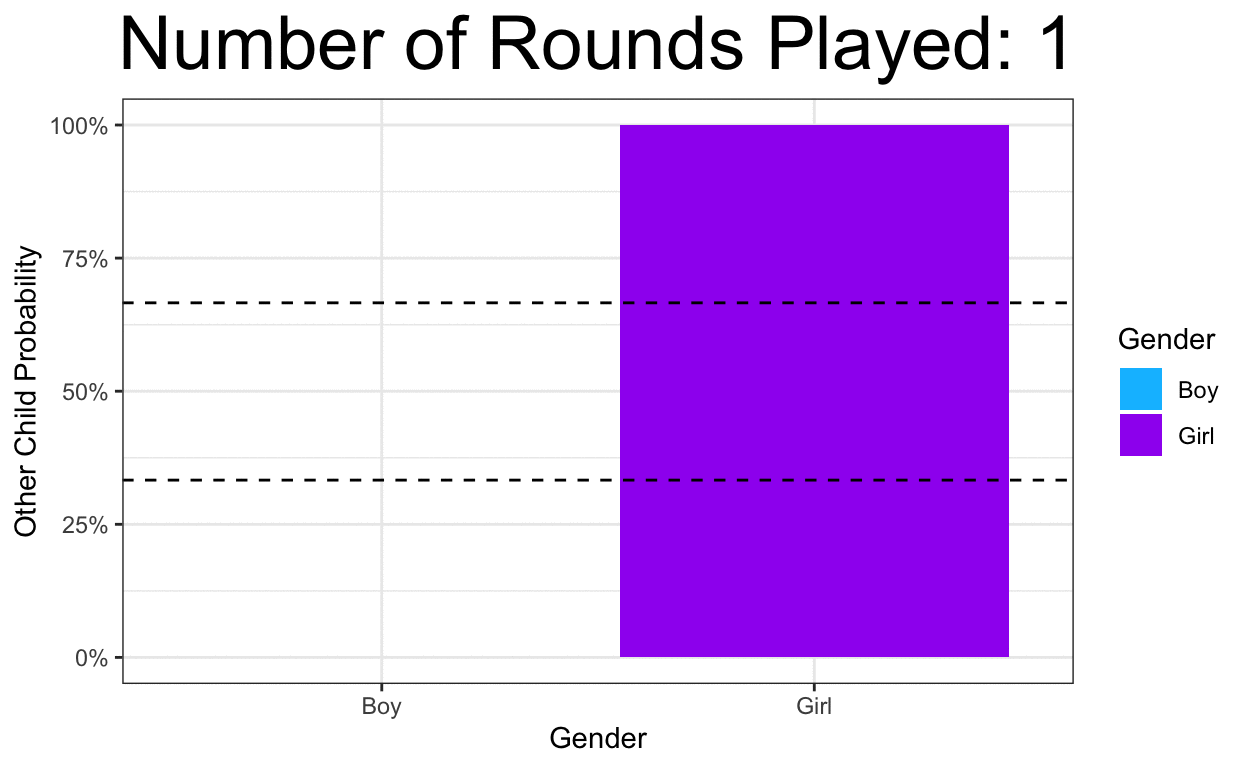 According to the math explained above, the chance of the other twin being a girl should be 66% and for a boy 33%. I think it is super cool to see how as more rounds are played in the image below, each bar gets closer to that line/mark. This further proves to me that the answer to this question is correct and be proven outside of reason.